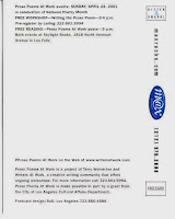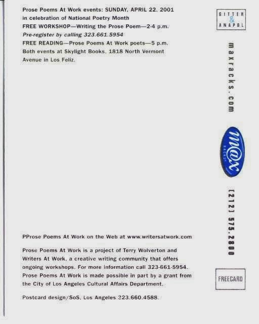 PROSE POEMS AT WORK. YEAR 2001. POSTCARD #6. Poetry Award from Writers At Work, Los Angeles, CA. POEM: Migration Fields. Unfinished version originally written in English.
